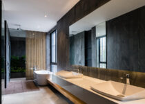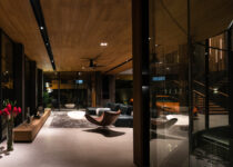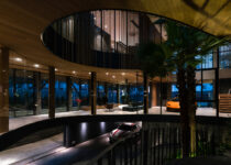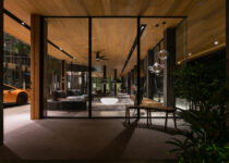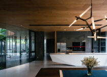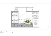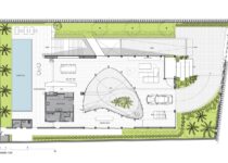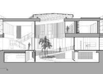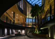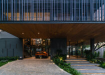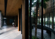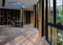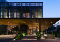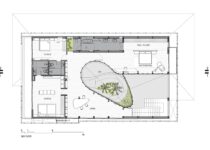 O subsolo tem capacidade para sete carros, com um pátio central para entrada de luz natural e ventilação. O acesso principal começa aqui, seguindo uma rampa através deste ambiente aberto repleto de vegetação, que conduz ao nível superior com a sala de estar, jantar e cozinha.