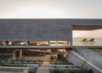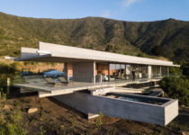 A empresa chilena Felipe Assadi Arquitectos criou uma longa casa de concreto para um local inclinado com vista para o Oceano Pacífico, com porções extensas formando varandas cobertas e uma piscina perpendicular.