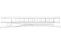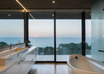 A longa fachada voltada para o oceano é quase totalmente envidraçada em ambos os níveis, enquanto as paredes de concreto em direção à montanha apresentam aberturas muito menores.