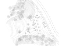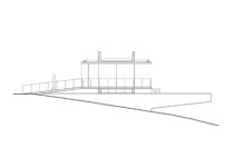 A casa de dois andares é levantada do chão inclinado, permitindo que uma passagem corte abaixo para conectar os níveis.