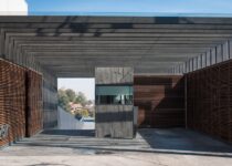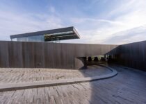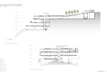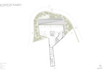 Esta peça resulta em quatro níveis e, à medida que se adapta ao solo, é transformada em uma estrutura (parede ou laje) e uma praça ou terraço aberto. Uma solução que cria uma forma elegante e sutil com uma clara horizontalidade entre a vegetação nativa do contexto.
