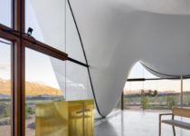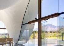 Na parte interna, um espaço de encontro grande e aberto é criado dentro de uma planta retangular simples. Os pisos são altamente polidos e refletem a luz internamente. O teto branco e ondulado projeta uma série de sombras que dançam dentro do espaço enquanto os níveis de luz mudam ao longo do dia. Esta modesta paleta de materiais cria um pano de fundo neutro para as impressionantes vistas emolduradas dos vinhedos e das montanhas.