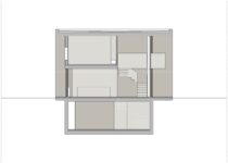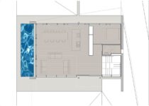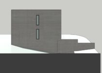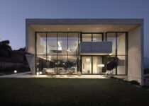 A parte oriental da casa (a sala de estar, entre outros cômodos) foi concebida como um espaço de pé-direito duplo que dá para o jardim através do monumental pano de vidro com perfis de alumínio preto. O pavimento superior contém os cômodos que exigem mais privacidade. Uma laje de concreto parece dobrar-se por todo o volume do edifício, que inclui balanços generosos que impedem o sol de chegar nos espaços interno durante o verão e, portanto, é protegido contra o superaquecimento nessa estação.