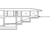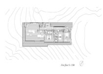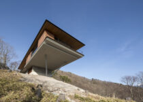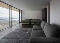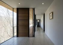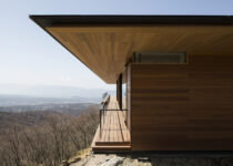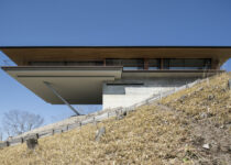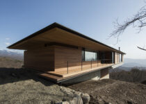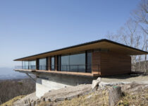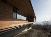 Para apoiar este grande piso suspenso, foram introduzidos dois cilindros de aço diagonais, cada um com 300 mm de diâmetro. Com isso, a casa flutua no meio de uma gloriosa paisagem natural. Com esta estrutura, a brisa da montanha flui através do interior, fazendo-o coexistir com a natureza.