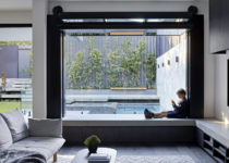 Uma característica da sala de estar era a janela de dobra dupla com contrapeso, que cria uma visão ininterrupta do assento de concreto in situ.