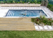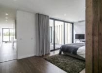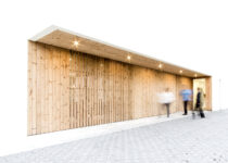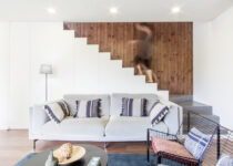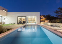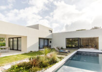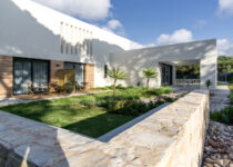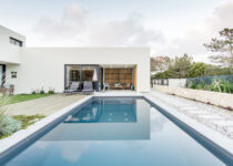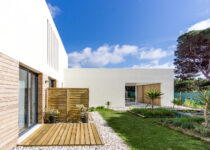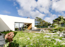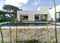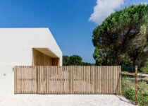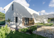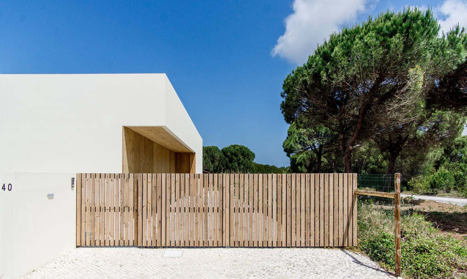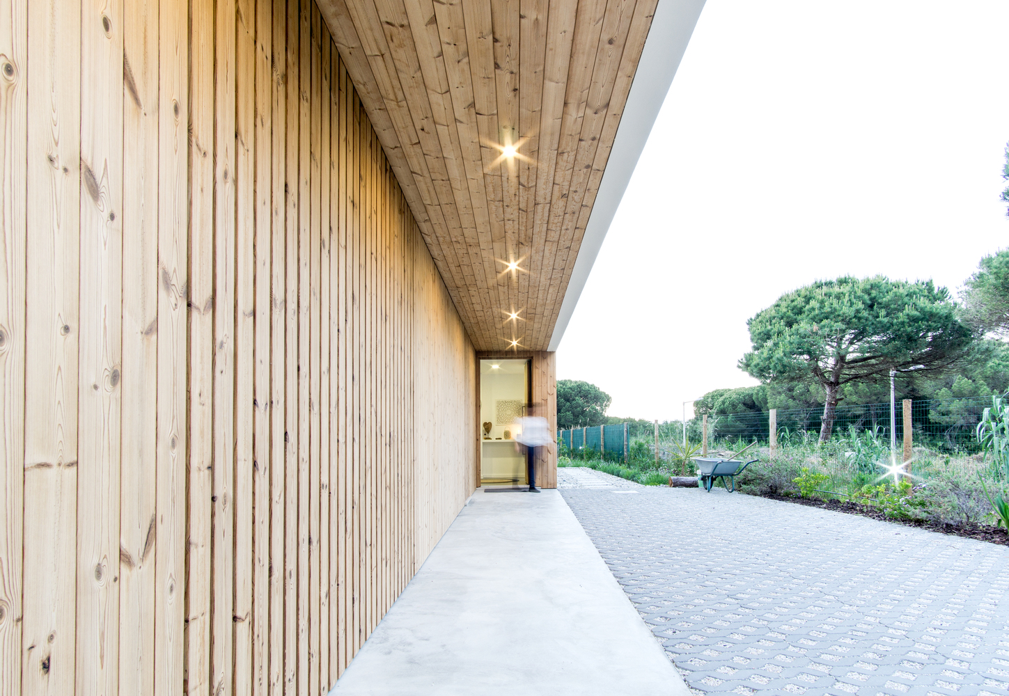 A entrada principal é marcada por um rasgo horizontal na extremidade do volume, enquanto a entrada tardoz é marcada por um rasgo vertical, ambas revestidas em ripado de madeira de natural. O jardim Sul, com a piscina e as zonas de estar públicas, transforma-se num verdadeiro pátio resguardado do vento, de um lado a cortina de vegetação, do outro a arquitetura que abraça e protege o espaço. O jardim Norte dá lugar a aromas e sabores, uma horta, um pomar, flores autóctones e especiarias várias. A cobertura, um grande terraço projetado para a paisagem, juntamente com um pequeno pátio, definem os espaços exteriores e intimistas do piso superior.