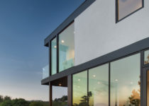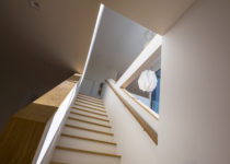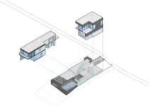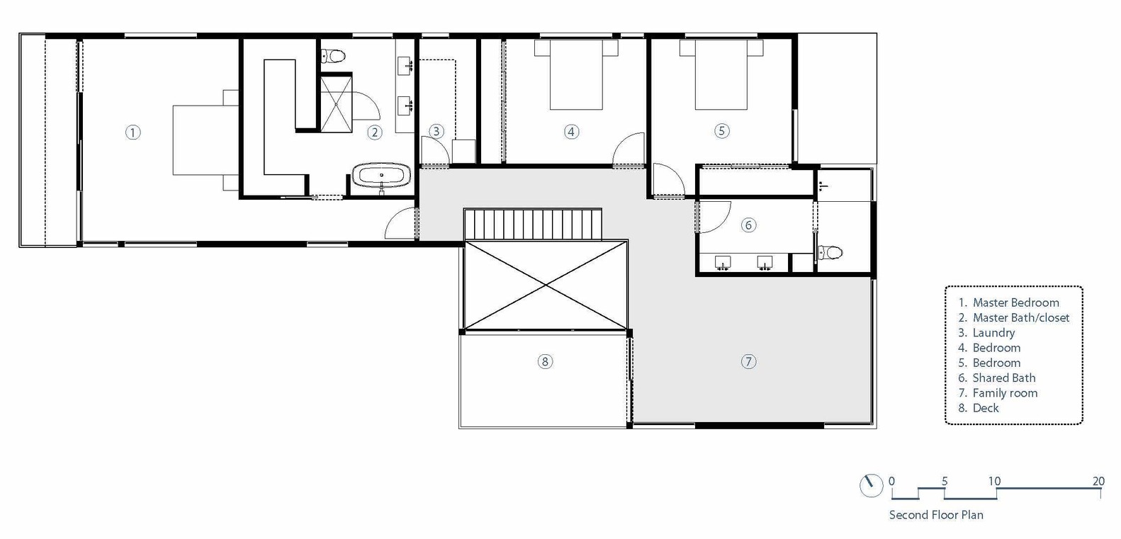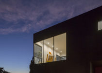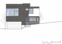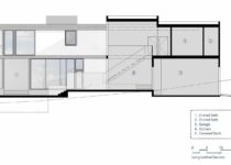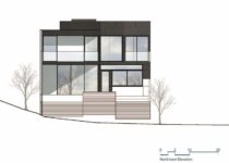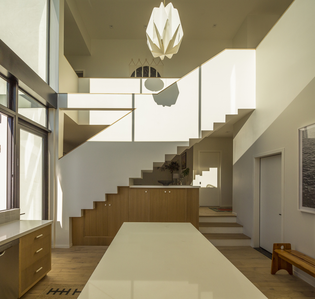 Formada por dois volumes interligados, um cubo e uma barra, a casa responde à forma, escala e recuos de seu contexto suburbano, ao mesmo tempo que também se estende para dentro do terreno, maximizando a relação com a paisagem e as vistas do entorno. O acesso principal da casa acontece na intersecção destes dois volumes e termina na escada escultórica encontrada no centro do espaço. Tecendo estes dois volumes juntos, o núcleo da escada serve como centro de atividade da casa.