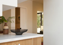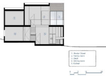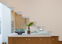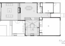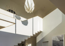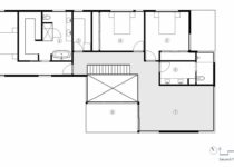 No piso térreo, o ‘cubo’ abriga a garagem e a generosa cozinha, aberta para o terraço da piscina, enquanto a sala de estar da família e o deck ficam no segundo pavimento. Já no piso térreo da ‘barra’ se encontram a sala de jantar, a sala de estar e o terraço, enquanto que no segundo pavimento estão os quartos e a lavanderia, resguardados dos olhos da rua.