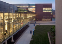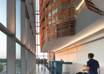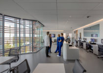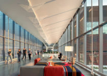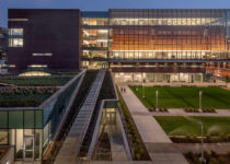 “A ala oeste em balanço funciona como uma lanterna, proporcionando vistas noturnas, diurnas e iluminadas dos avançados laboratórios de simulação que aparecem suspensos dentro do prédio”, disse a equipe.