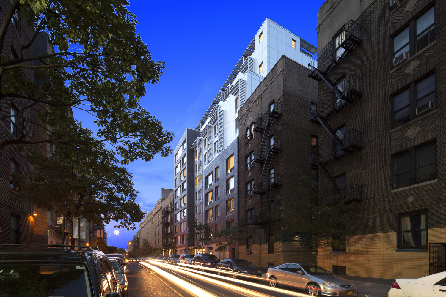 Desviando-se dos grandes blocos que dominaram habitações públicas americanas por décadas, o Designing New York recomenda dividir o volume dentro de um edifício para permitir a variação nas unidades e a criatividade dentro do código de zoneamento. O Creston Avenue Residence, no Bronx, usa volume não convencional para mesclar-se com a escala de vizinhança (na maioria edifícios de apartamentos de cinco andares) enquanto maximiza o número de unidades oferecidas. Nesse projeto da Magnusson Architecture & Planning, as fachadas voltadas à rua “alinham-se às residências mais antigas adjacentes e refletem sua escala menor, enquanto a parte central, revestida de painéis de metal, é recuada para criar uma entrada coberta generosa”.