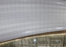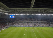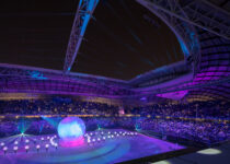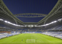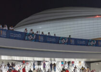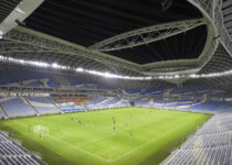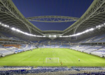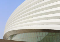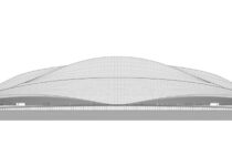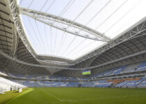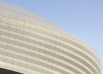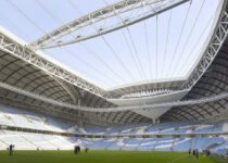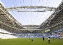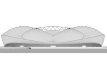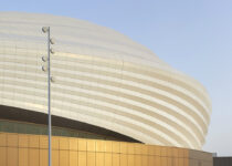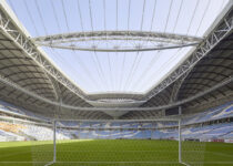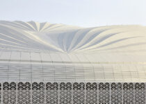 The stadium’s opaque roof and wall areas are expressed as pleated cross sections. This feature, which has its origins in Arabic motifs and calligraphy, adds texture to the outer shell and also emphasizes the stadium’s unique geometry. The external cladding materials are deliberately selected from a limited palette of materials and choice of colours; namely white for the roof and wall cladding, and darker colours for the areas below the eaves, including the lower level curtain walling with its ornamental lattice screen print that provide shading.