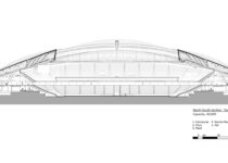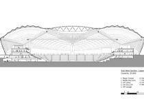 The stadium’s roof design is an abstraction of the hulls of dhows turned upside-down and huddled together to provide shade and shelter. This is expressed in the stadium’s envelope geometry, details and selected materiality, including the roof’s beam structure that echoes the interior structure of a d’how’s hull. The facades of the stadium are slanted outwards, tapered in elevation and reminiscent of the pleating of a dhow’s sails. The image of the dhow is further emphasized through the large overhang of the stadium’s eaves that incorporates strips of metal cladding reminiscent of the timber structures used in a dhow.