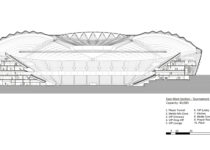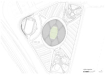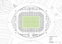 The stadium sits on a large landscaped podium that takes visitors from grade to the entry level main entry concourse located at the middle of the seating bowl’s tiers. This podium connects the stadium into the adjacent landscape and reduces its scale. Large parabolic voids within the podium signify different activity zones. On the eastern side, voids allow for the majority of spectators to arrive and depart from the stadium. The northeastern void will include a community market whilst the southeastern void hosts an activity park. To the west, the parabolic void within the podium allows for vehicle access and drop off at grade for the players, officials, and dignitaries.