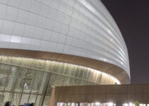 The colour scheme for the external building envelope dovetails with its geometric forms and reinforces the articulation of the outer skin. The roof cladding and opaque surface areas above the eaves are white or off- white in colour with a gloss surface finish that is reminiscent of seashells and emphasizes the pleats which add texture to the building envelope. The embossed eaves and the lattice screen print of the glazed lower- level facades are metallic bronze in colour, adding a sense of richness and depth to the design. The choice of a bronze metallic finish of these worked surfaces pays homage to the traditions and artistry of Islamic craftsmanship.
