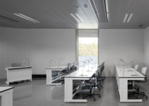 In the distance, the building exhibits an ingenious volumetric composition, matching its scale to that of the buildings of the Miramón technological park. The coverings function as gardens for the cultivation of edible and aromatic plants, in an attempt to compensate and neutralize the presence of the building in relation to the surroundings.