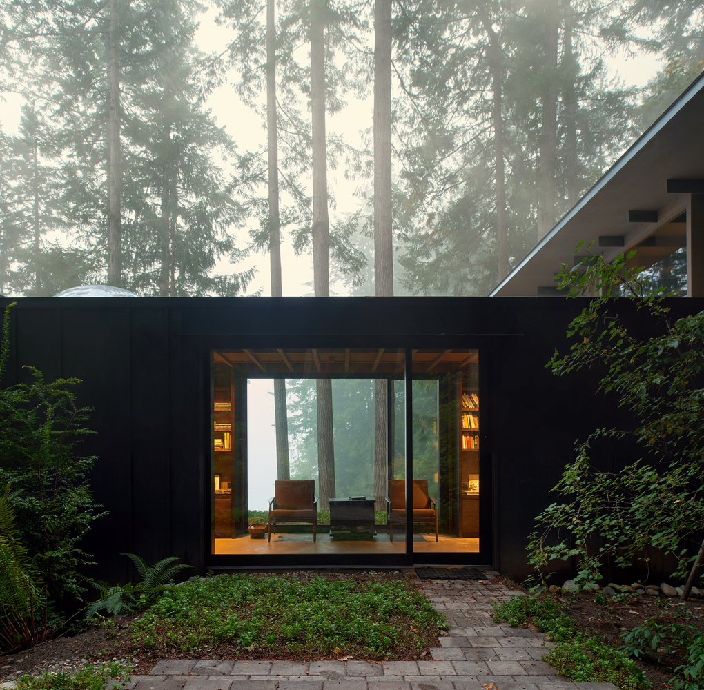 In the 1980s, the retreat consisted of three tiny pavilions linked by wooden platforms. In 2003, the pavilions were connected by a unifying roof, creating a single form grounded nto the hillside and projecting out over the landscape. The living room’s large wall of glass frames a view of the adjoining grassy field and Puget Sound, visually blending the indoors and outdoors. In 2014, a master bedroom and two guest rooms were added, creating a retreat of 2,400 square feet.
