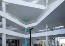 A campus with orderly arranged static and dynamic spaces will serve as a vitality catalyst for the 10-minute break time between classes. The inner courtyard is full of ups and downs like a canyon. The academic lecture hall and the auditorium are built along the way, where the ecological atmosphere is not scarce. The inner modular ceiling provides the necessary light control for the site, and the vertical facade uses vertical grilles to block the direct light of the blackboard area, which also adds some rhythm to the space.