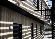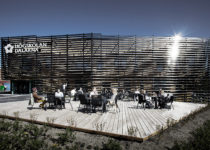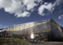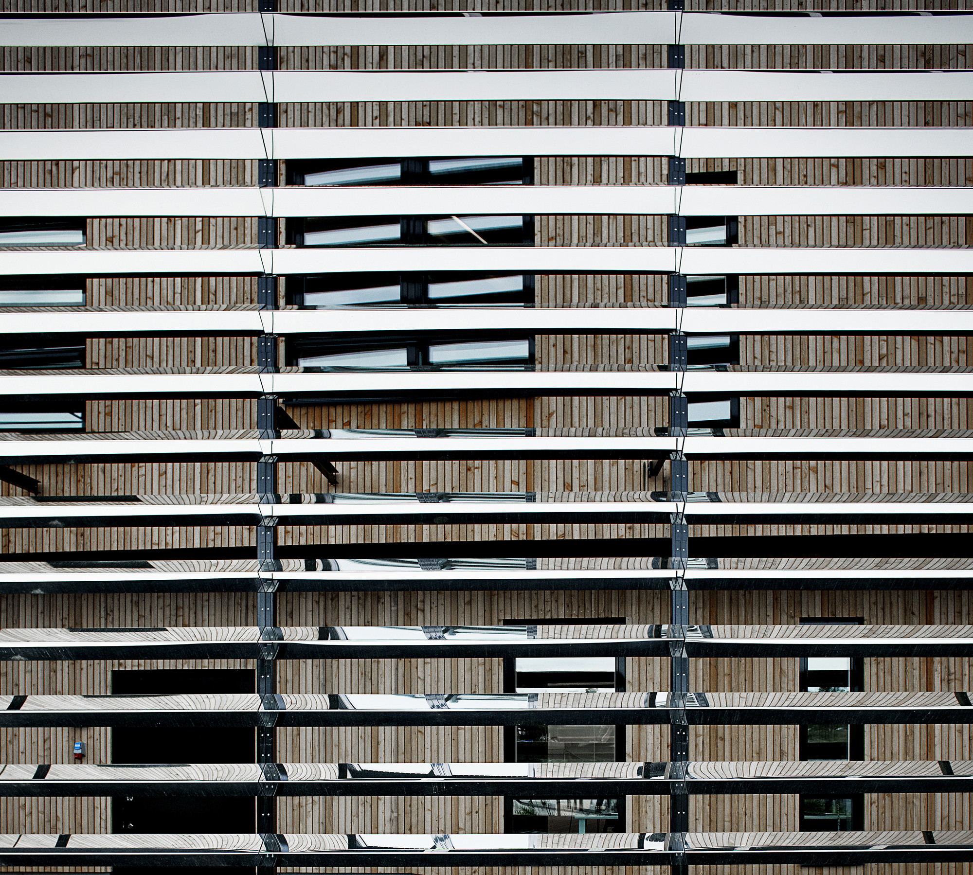 The characteristic double facade with reflecting horizontal lamellae fronting a wood cladding is developed in collaboration with Danish artist Jeppe Hein. Instead of creating an isolated piece of art work Jeppe Hein and Adept has developed the competition design for the façade into a detailed and refined expression with an immateriality that mirrors its surroundings and the people in it with broken reflections. The lamellas are made from highly polished stainless steel while their wooden background is a Siberian larch.