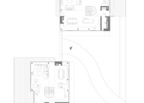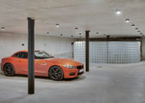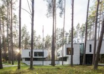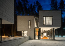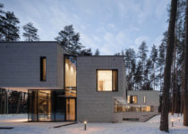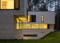 All of the technical utilities and parking is placed in the basement. The road to access the garage is hidden between two volumes and is almost invisible from all perspectives, thus the forest surrounding the house is not disturbed by any vehicles. Sharp shapes of stone cover external walls and extend to the interior, while planes of glass façade are designed in a way that from inside, the relationship with surrounding landscape seems fluid.