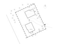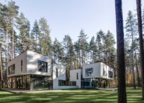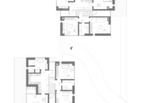 Houses of the same plan structure arranged perpendicularly and connected by a common underground parking. The main axis of structure is an atrium with a staircase which joins three levels of the house: basement, ground floor, and the first floor. Ground floor space is structured on the open plan principle. Kitchen, dining area, living zone and home office is planned around staircase with skylight.