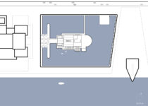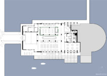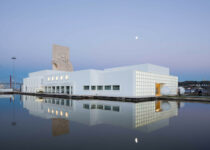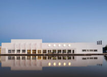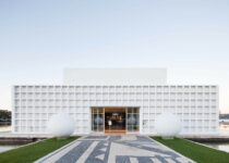 The building is flanked by a large water feature that reaches out to the river to create a sensation of floating. The overall structure follows a rigorous metric that shares its proportions with large sculptures that lead to the entrance.