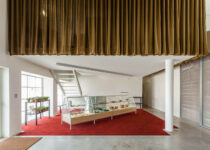 To the north, there is a quieter leisure area with views towards the Belém Cultural Centre and the Monastery of Jerónimos, as well as a shop and mezzanine. From here can also be seen the stairs leading up to the first-floor office area. To the west, in the main entrance zone, an open space serves as an art gallery and music venue.