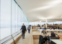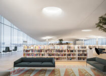 “Book Heaven” on the top floor, is a vast open landscape topped with an undulating cloud-like white ceiling punctured by circular rooflights. Here the best characteristics of the modernist library meet the possibilities provided by 21st Century technologies. The serene atmosphere invites visitors to read, learn, think and to enjoy themselves. From this level visitors can enjoy an unobstructed 360-degree panorama view of the city centre or step out onto the terrace overlooking Kansalaistori square.