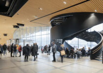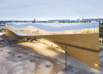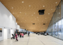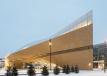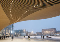Oodi has been built using local materials and with local climate conditions in mind. The timber façade is clad with 33-millimeter-thick Finnish spruce planks that conform to the sweeping curve that extends the building outwards to create a canopy above the Kansalaistori square, blending the interior and exterior spaces and creating shelter for public events in front of the library.