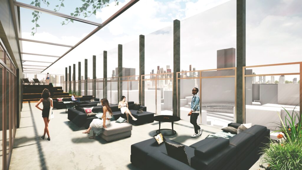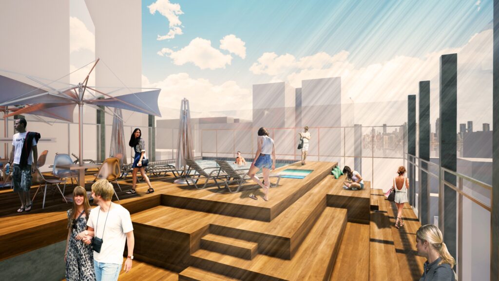On the roof of the building, a gym, gourmet kitchen, and pool with a solarium complete the users’ experience, providing a leisure and relaxation environment. The building structure was designed to allow the integration of the building’s people with its surroundings. The opening of the ground floor for public use allows permeability in the lot, with two shops that serve the residents and neighbors of the neighborhood.