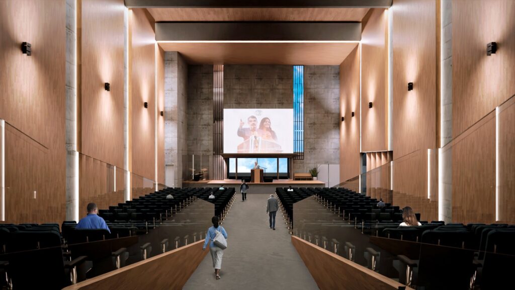 The immersion baptism space is an area that deserves attention in the architecture of this project. The pool representing the element of purification and preparation is an element that adds value and meaning to the religious experience of people who attend the church. The strategic location of this space in a transition area between the nave and the outside makes it even more significant and remarkable. The reception and orientation area is a vertical building above the nave that stands out for its flexibility and versatility. The classrooms and multimedia rooms and experiences for children and families during worship services are designed to ensure that everyone feels welcomed and comfortable on site.