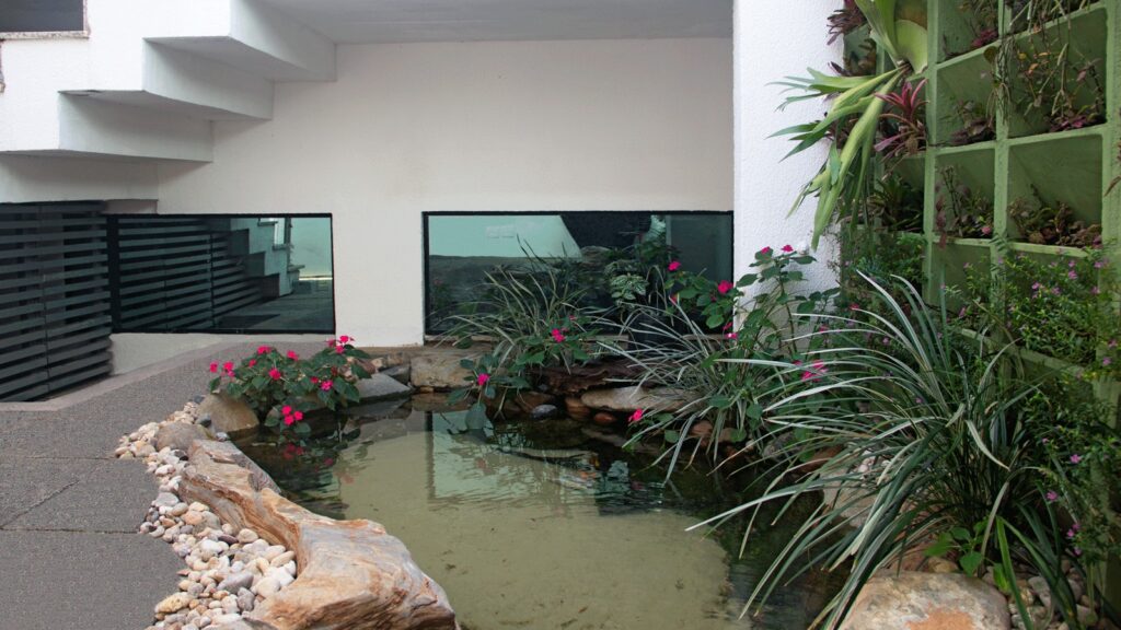 The building was divided into four main sectors, with the lower areas of the buildings concentrating the storage area for products, packaging, and equipment, as well as the dispatch area for better control of the flow of incoming and outgoing products. In this way, we sought to optimize the company’s internal logistics. On the ground floor of the newer building, the reception area, auditoriums for lectures and training, as well as a coffee and events area with space for a buffet and a garden that brings a pleasant and bright atmosphere, were concentrated. In addition, we created an exhibition laboratory with windows to the coffee area, in order to propose an immersive experience of people with the company’s products. This area was designed to offer a welcoming environment and conducive to networking.