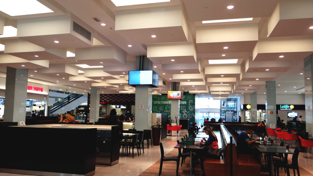 The shopping center’s architecture is marked by the presence of large atriums, internal squares, multilevel balconies, and green elements, which give the environment a city-like feel. Another striking feature is the concrete panels with high relief, with shadow and volume effects.