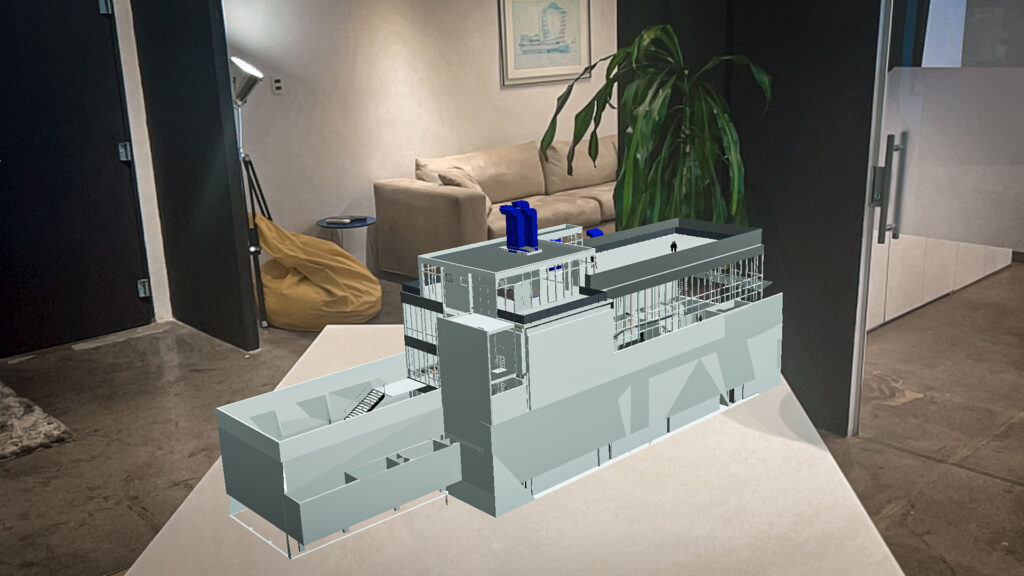 After the project is positioned, we can adjust the visualization settings, scale, and other factors. It is also possible to “walk” through the 3D model in augmented reality, viewing it in either reduced scale or actual size in the field without the need for printed plans.