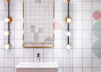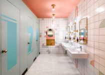 A mint-green lacquered box contains the cubicles and the lights and mirror fixtures are made from bronze.