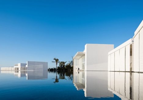 White blocks containing guest accommodation appear to float on expansive reflecting pools at this minimalist Mexican hotel by Taller Aragonés. Hotel Mar Adentro sits on the coast of San José…