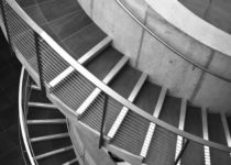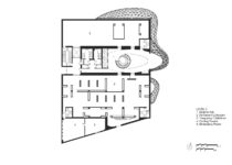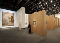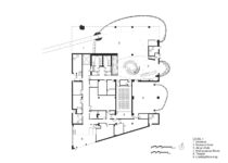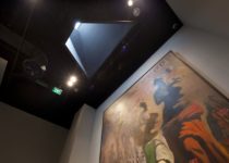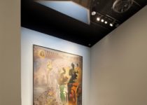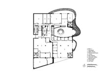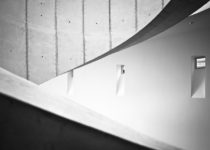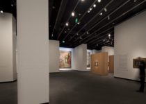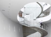 A poured-in-place, sculptural concrete spiral staircase beckons visitors to the galleries above. In the Permanent Gallery, black plaster light cannons focus natural light on seven large “Masterworks,” illuminating the paintings with UV-filtered daylight within curatorial standards.
