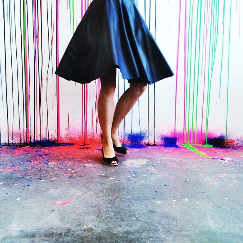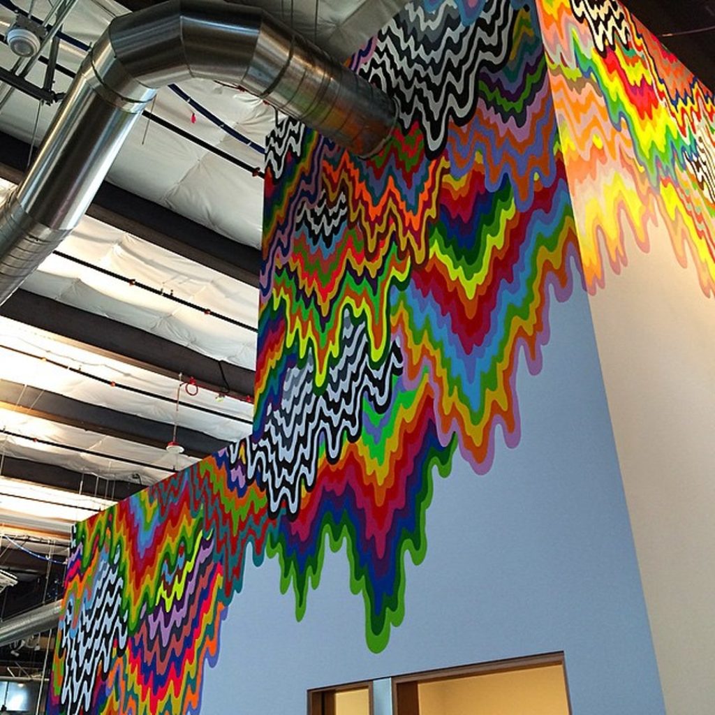 Artists such as Scott Boms, Josh Higgins and Drew Bennett — who produced similar artwork in Facebook’s original campus, on the other side of the highway — have enlivened the interior with bold strokes of vivid paint, which drips down the walls like the remnants of a Jackson Pollock or Barnett Newman masterpiece.