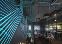 O projeto toma forma a partir de uma ideia divertida de ampliar as linhas do logotipo original de Hubba e as multiplicando para que ocupem e unifiquem o espaço no primeiro e segundo pavimentos.