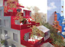 Assim como as varandas reflexivas do edifício da esquina, a estrutura das estufas, ou Green Houses, é composta por uma série de painéis de aço reflexivo. Terraços externos e as varandas envidraçadas funcionam como pequenas estufas que contrastam com a materialidade dos tijolos laqueados vermelhos que compõe a estrutura principal de seu edifício.