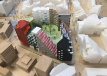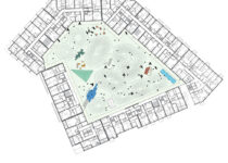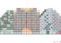 Finalmente, o último volume é o coração desta ilha verde, um edifício que rompe com o alinhamento contínuo dos outros blocos para então definir e organizar uma de suas ruas internas. Suas enormes lajes de concreto proporcionam múltiplas formas de terraços jardins, pensados como grandes áreas de estar abertas com vistas para a praça central.