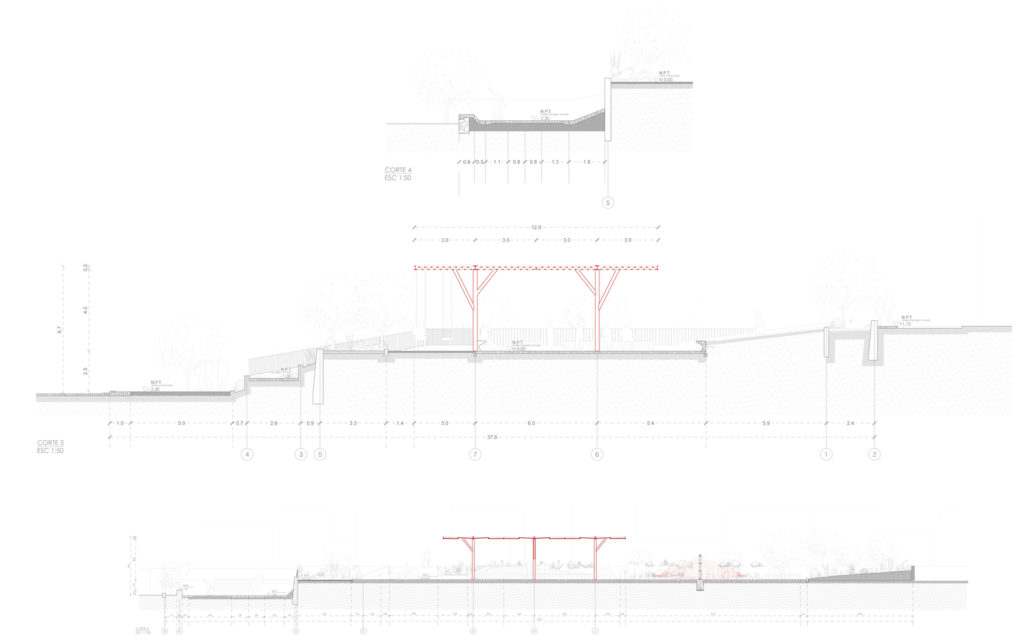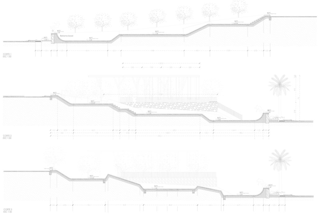 Como a praça está localizada em um terreno em desnível, duas rampas que cruzam o terreno de maneira transversal foram propostas e, com isso, descartou-se a necessidade de escadas, o que torna o local mais acessível.