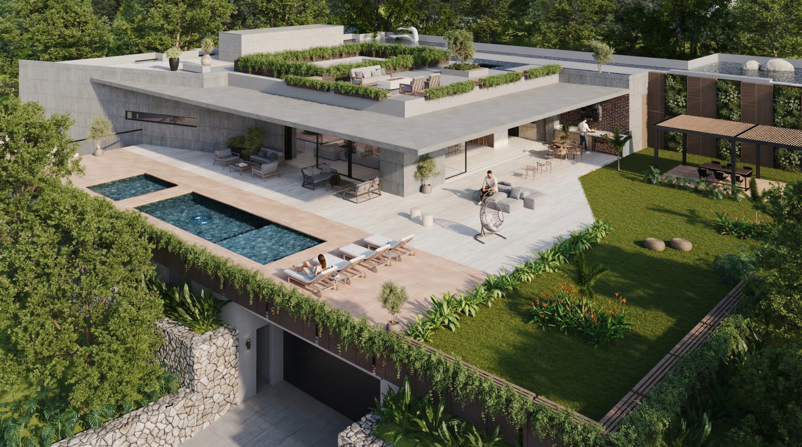 Este projeto residencial de alto padrão foi concebido para oferecer conforto, funcionalidade e uma integração plena com a paisagem natural. A edificação se implanta de forma equilibrada no terreno, explorando volumes bem definidos, linhas horizontais marcantes e uma forte relação entre interior e exterior. O paisagismo envolve toda a edificação, reforçando a conexão entre arquitetura, natureza e bem-estar, além de contribuir para a qualidade ambiental dos espaços.