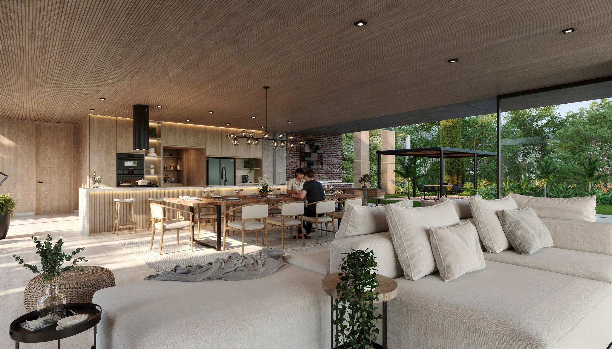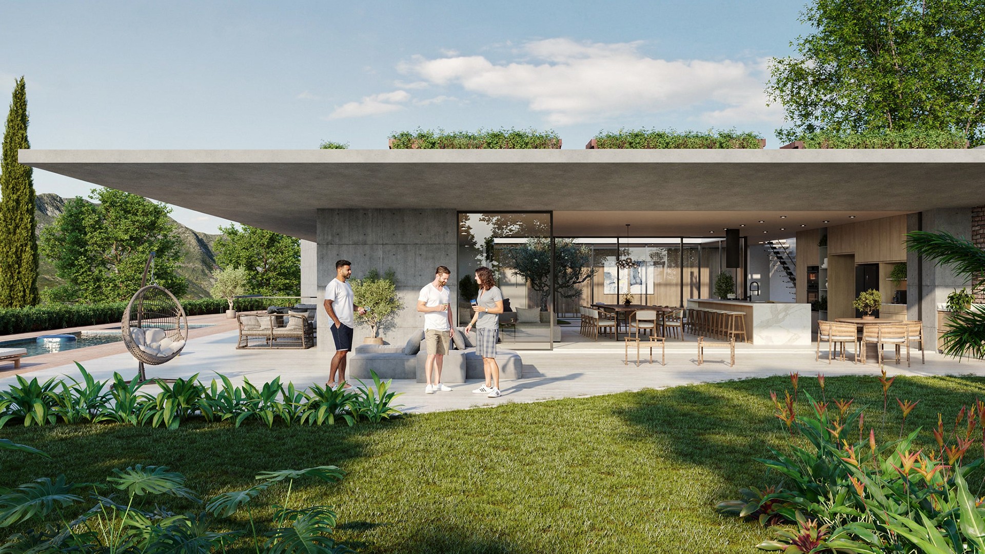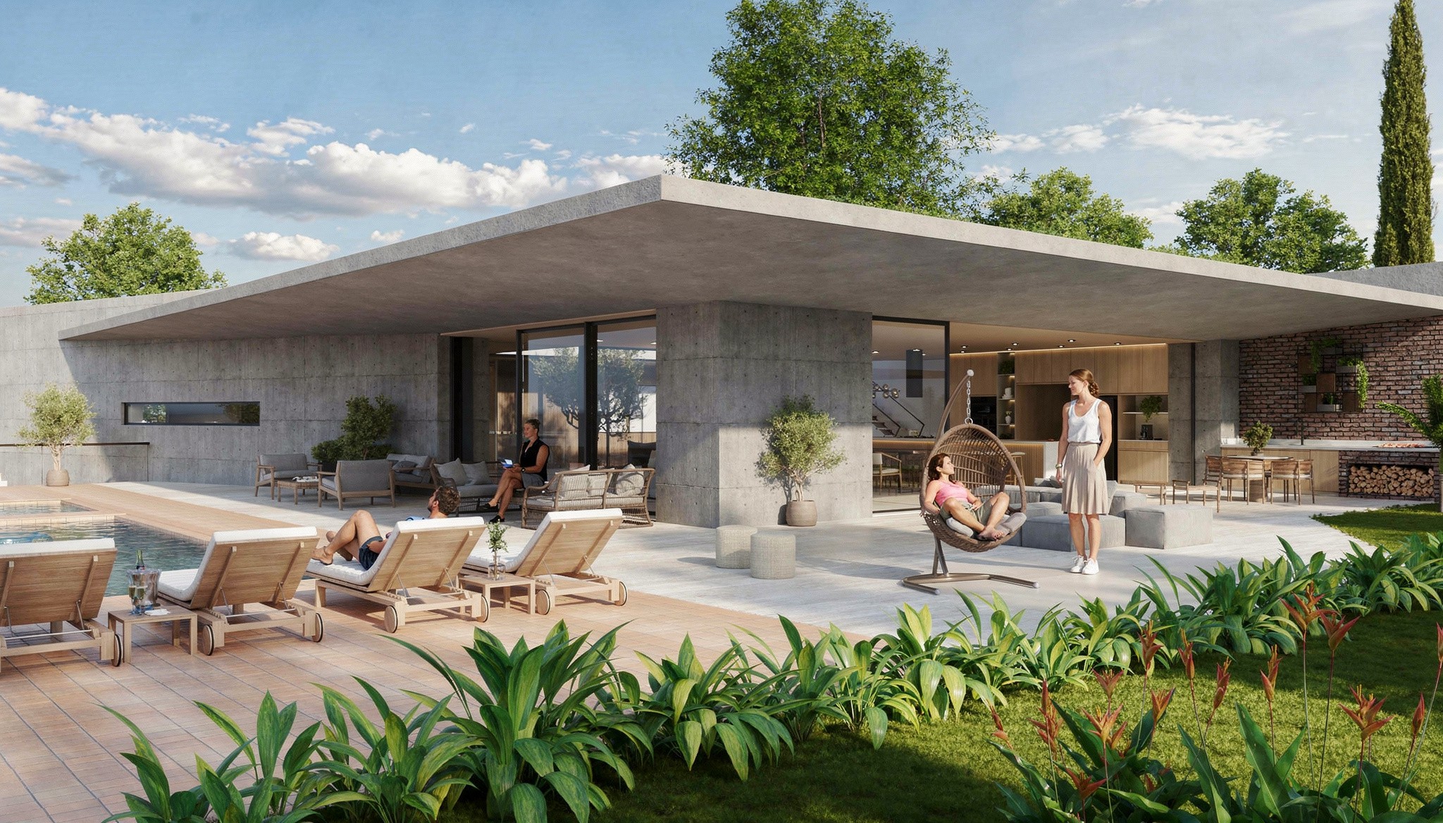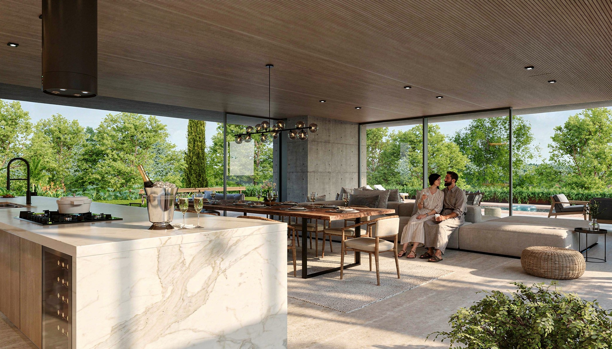 A linguagem arquitetônica adota uma estética contemporânea e atemporal, marcada pelo uso de concreto aparente, grandes panos de vidro e elementos em madeira natural. Essa composição material equilibra robustez e leveza, conferindo identidade ao projeto e proporcionando conforto visual e térmico aos ambientes.