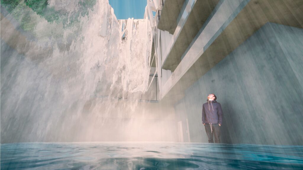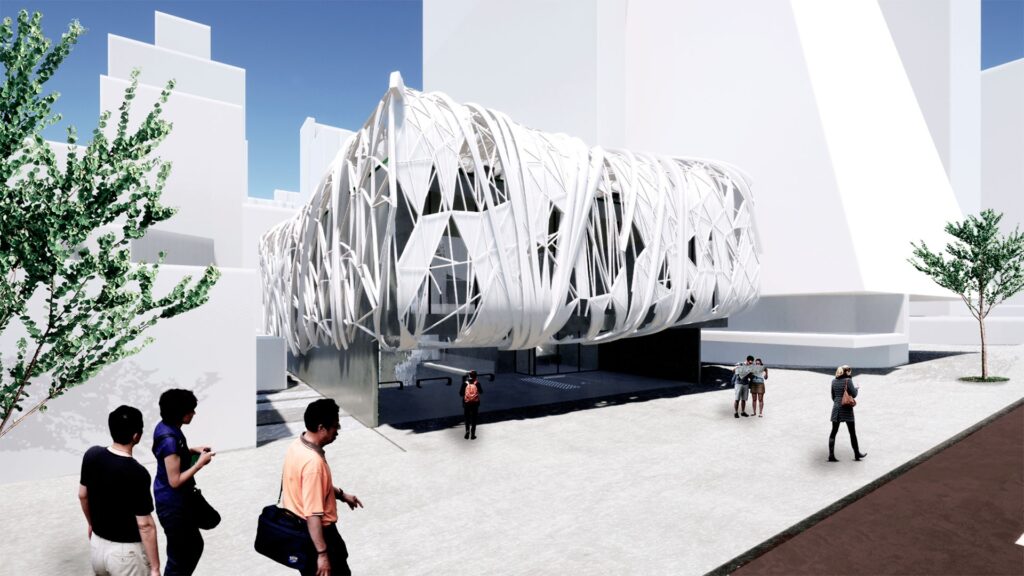 O projeto do edifício visa uma construção moderna que se integra perfeitamente ao ambiente urbano e acolhe todos que passam pela região. O térreo do edifício é projetado para proporcionar uma continuidade natural da calçada, com um espaço aberto que convida os usuários a entrar. Nesse ambiente, um elemento de destaque é o som relaxante da água que permeia o vazio central que conecta os três andares, proporcionando um ambiente agradável e convidativo.