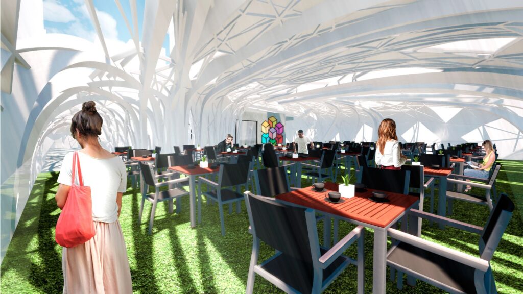 O edifício é projetado para integrar-se perfeitamente ao ambiente urbano, com uma fachada desenhadapara permitir a entrada de luz natural e oferecer vistas panorâmicas da região. Os espaços internos são organizados de forma inteligente, com a criação de um vazio central que conecta os andares e permite a circulação dos usuários de forma eficiente e agradável.