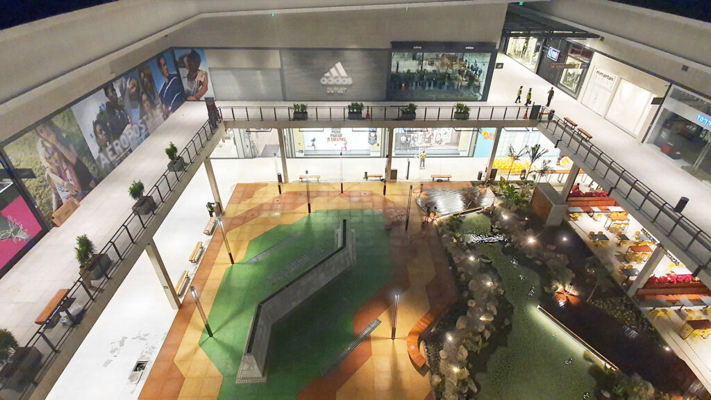 Uma das praças conta com um lago natural e um chafariz com jatos de água que fazem a alegria das crianças, enquanto a outra possui jardins naturais e brinquedos infantis, proporcionando um ambiente descontraído para toda a família. O destaque da fachada principal fica por conta de um dos maiores painéis de LED, que acentua ainda mais a grandiosidade do lugar.
