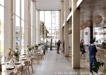 Um centro esportivo se prolongará todos os pavimentos, cruzando uma seção do edifício, com paredes de escalada, quadras e academia.