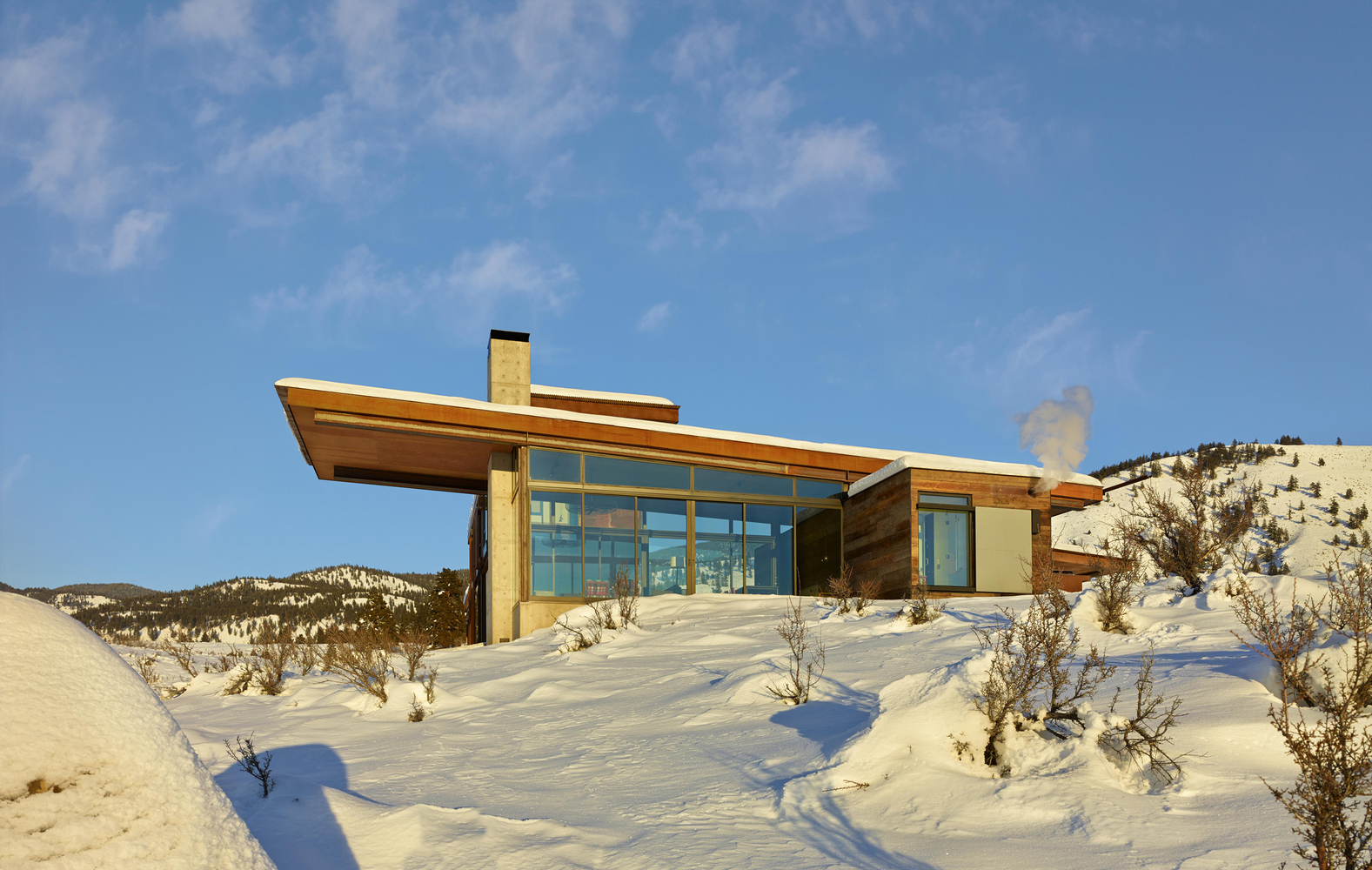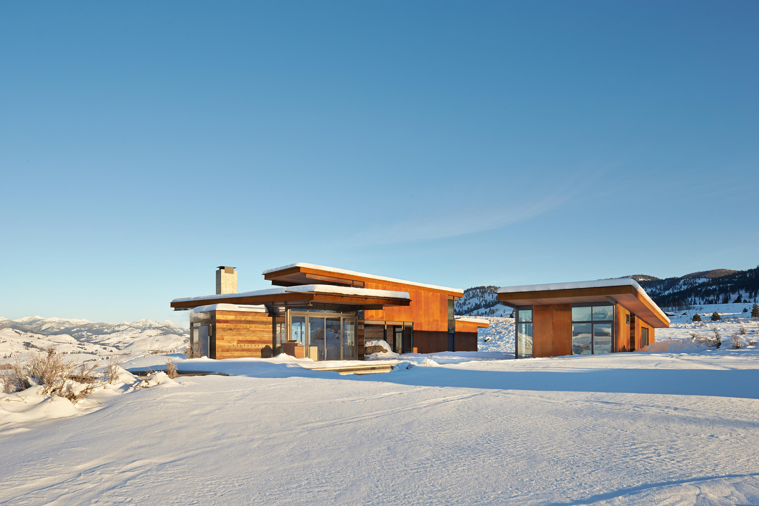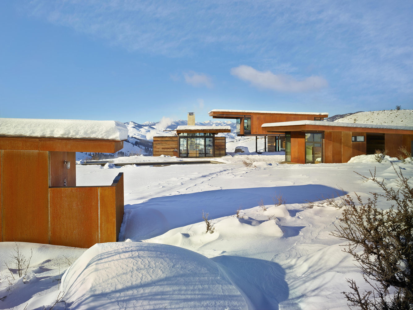 Cada edifício tem uma vista incrível, cuidadosamente composta por seu contexto, as Montanhas Studhorse e Lago Pearrygin. As áreas de caráter mais público, como a sala de estar, cozinha e bar estão agrupados em uma estrutura que se abre quase totalmente, com janelas de correr ao longo das paredes. O dormitório principal e quarto das crianças estão em outro edifício. Um terceiro abriga o quarto de hóspedes, para que tenham privacidade. Uma sauna está em um quarto edifício com uma vista privada por sobre o vale.