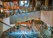 Esta “escada expressa” leva as pessoas até quatro andares em questão de segundos. Para que os compradores recuarem, a Jerde Partnership criou um caminho engenhoso de espiral descendente, em forma de saca-rolhas. Só uma parte do varejo da Langham Place mede 15 andares, no qual é um arranha-céu por direito próprio – um shopping “vertical”.